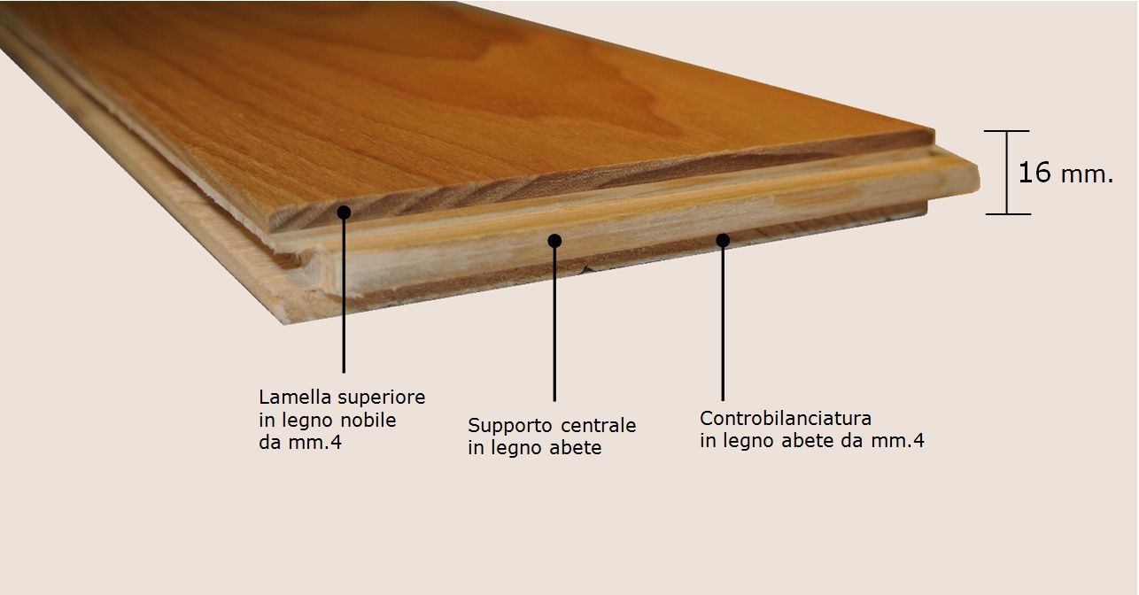 It's a prefinished plank three layers of good sizes for floors, ceilings and walls. The top layer is made of noble wood, available in various woods and finishes. Its thickness is mm.4,0 and the support is made of two-layer fir wood of mm.12.